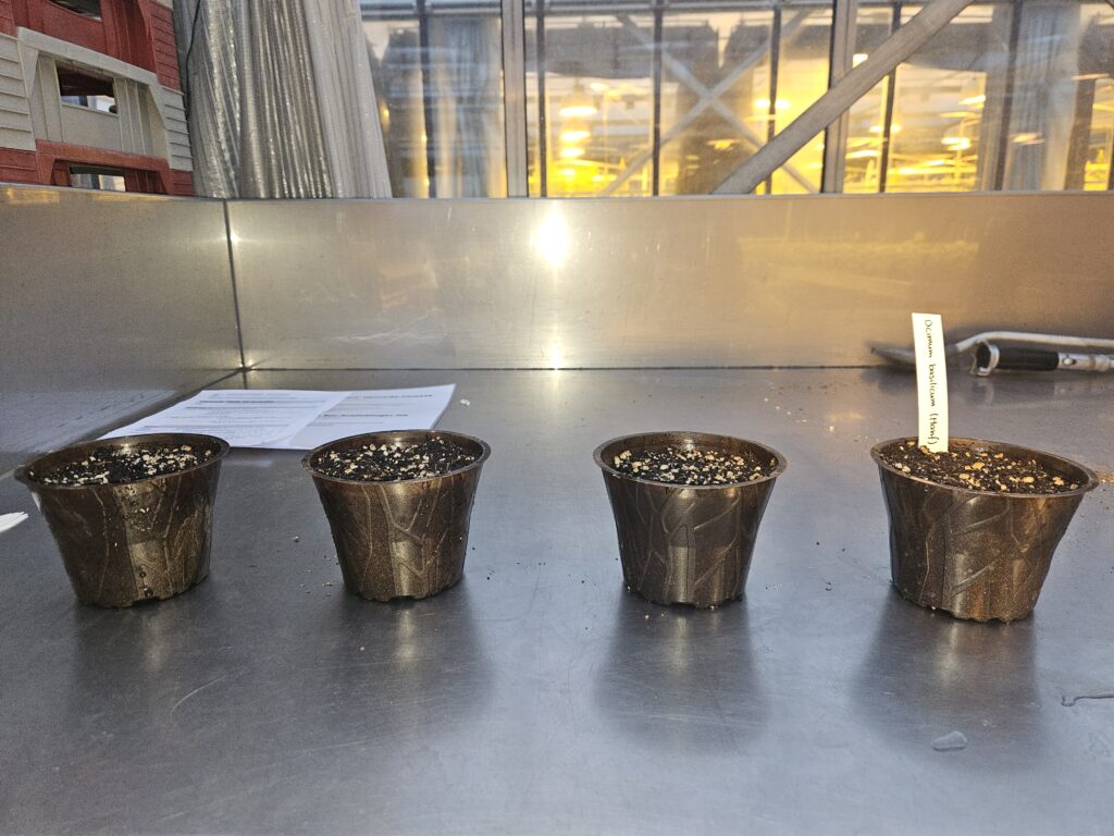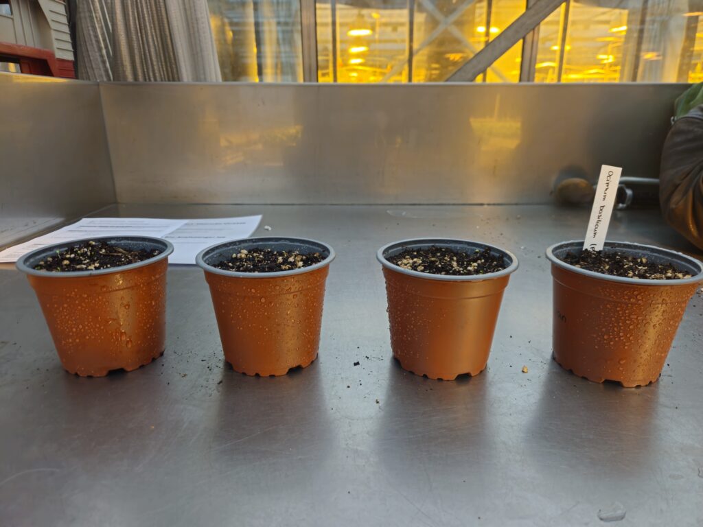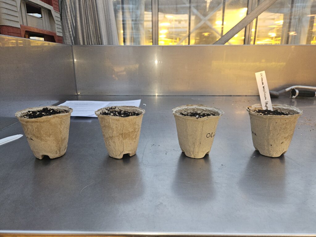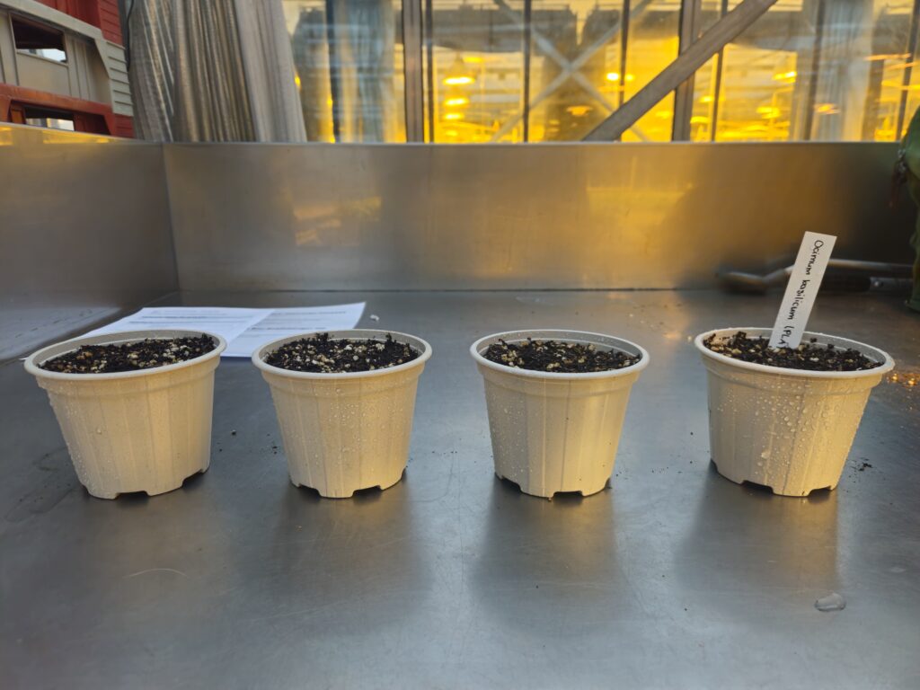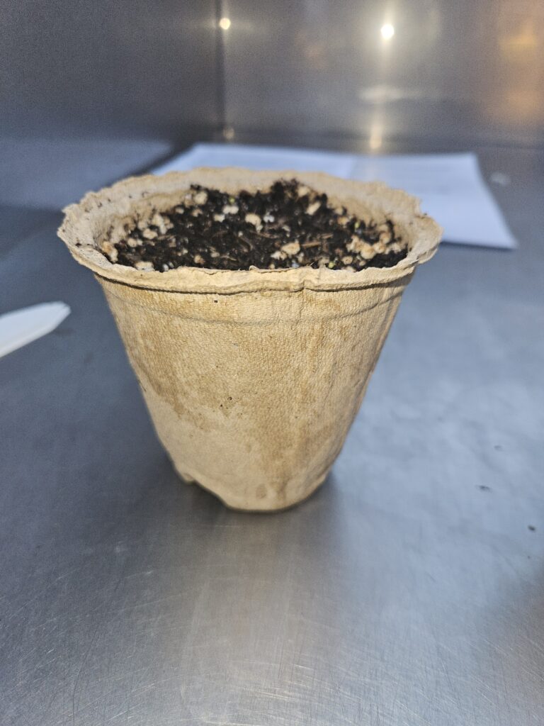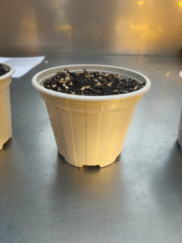 Als Vergleich diente ein herkömmlicher Kunststofftopf. Er blieb selbstverständlich vollständig stabil und zeigte keinerlei Materialveränderungen. Mit 4–5 Keimlingen lag hier der deutlich höchste Keimerfolg – ein Hinweis darauf, wie konstant die Bedingungen in traditionellen Töpfen sein können.