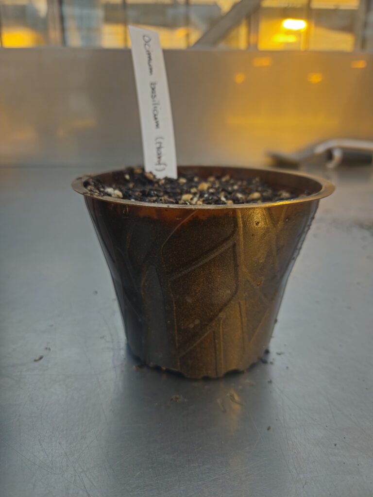 Dieser Topf zeigte leichte beige Verfärbungen, blieb aber stabil und wies keine Risse oder Schimmelbildung auf. Allerdings kam es zu keiner Keimung der Basilikumsamen. Das Material verhielt sich unauffällig, scheint aber für die Keimbedingungen in diesem Versuch weniger geeignet gewesen zu sein.