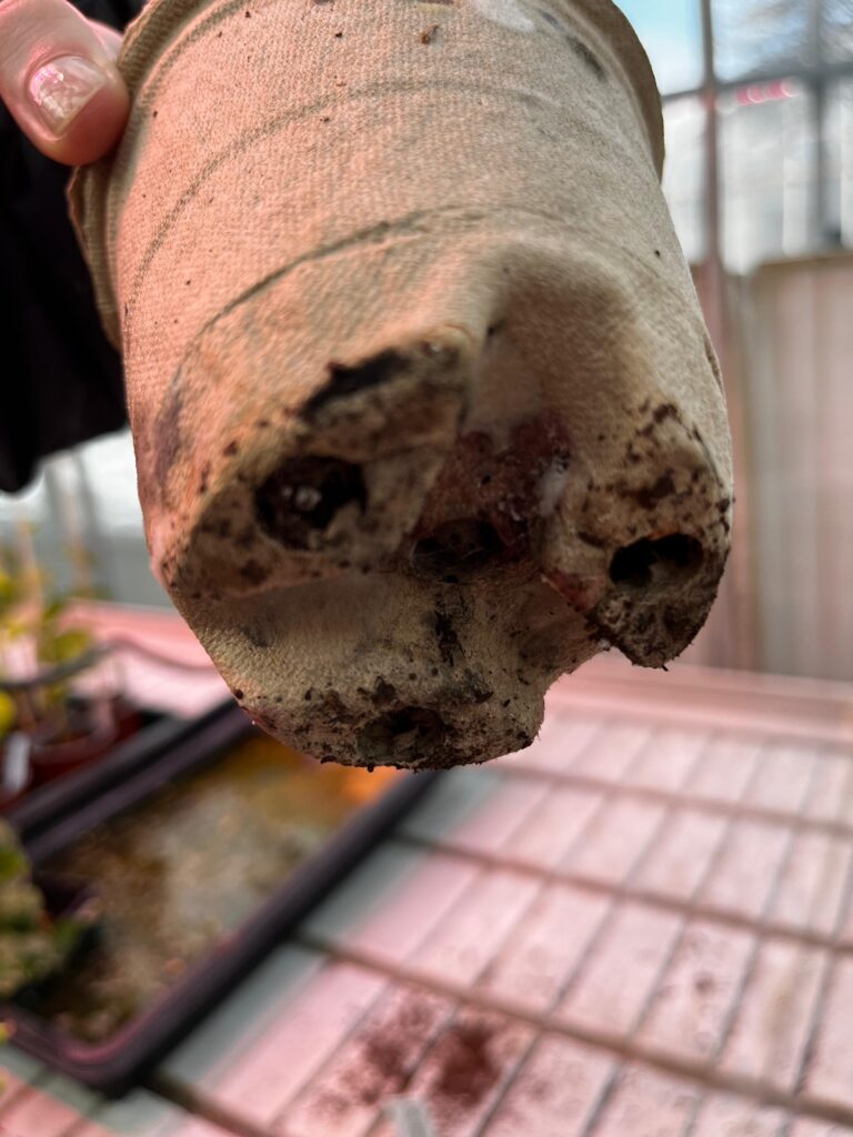 Der Papiertopf wies leichte Verfärbungen und etwas Schimmel auf, blieb jedoch stabil und ohne Risse. Die Keimlinge wuchsen auch in diesem Topf gut an und zeigten keine Beeinträchtigungen außer eine leichte Verzögerung.