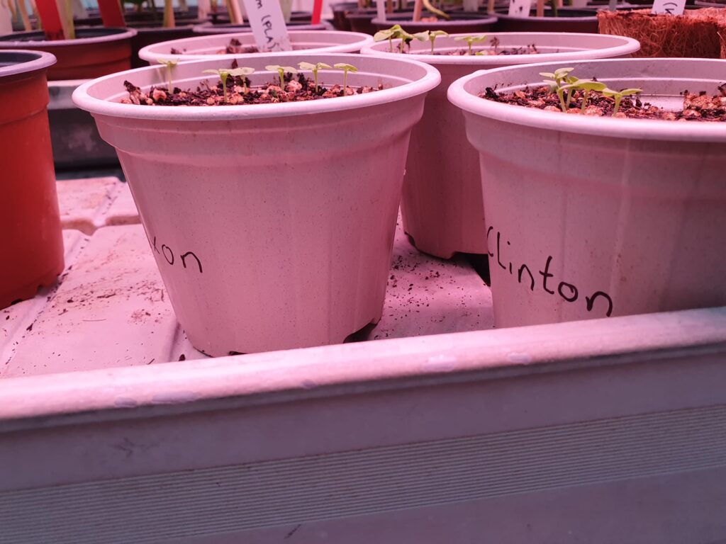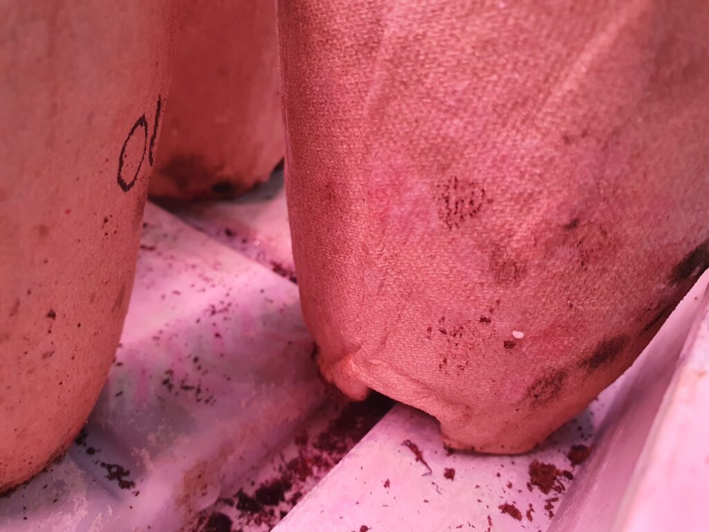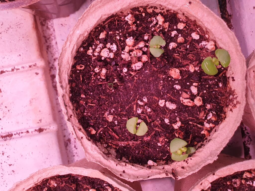 Der Papierpflanztopf zeigte leichte schwarz‑violette Verfärbungen sowie etwas Schimmelbildung, blieb jedoch stabil und ohne Risse. Trotz der sichtbaren biologischen Aktivität bot er den Pflanzen ausreichende Stabilität, sodass sich zwei bis vier Primärblätter bilden konnten. Hier zeigte sich ein etwas langsameres Wachstum im Vergleich zu den anderen Topfvarianten.