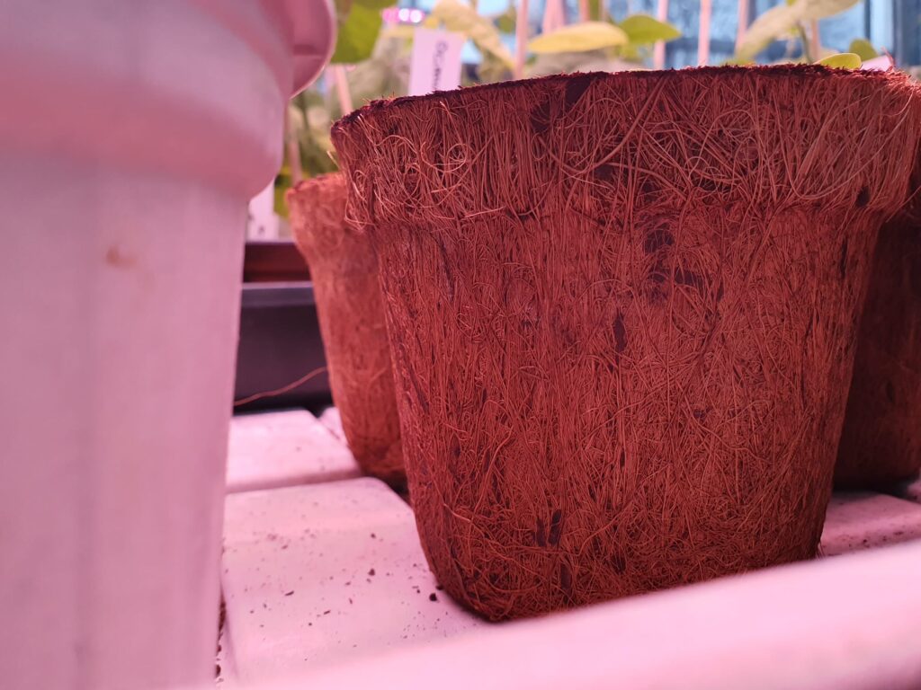 Der Kokosfasertopf nahm viel Feuchtigkeit auf und war deutlich vollgesogen, blieb jedoch formstabil. Die organische Struktur begünstigte eine leichte Schimmelbildung, wie sie bei stark naturbasierten Materialien häufig vorkommt. Trotz der hohen Feuchtigkeit entwickelten sich die Basilikumkeimlinge gut und erreichten ebenfalls vier bis sechs Primärblätter.