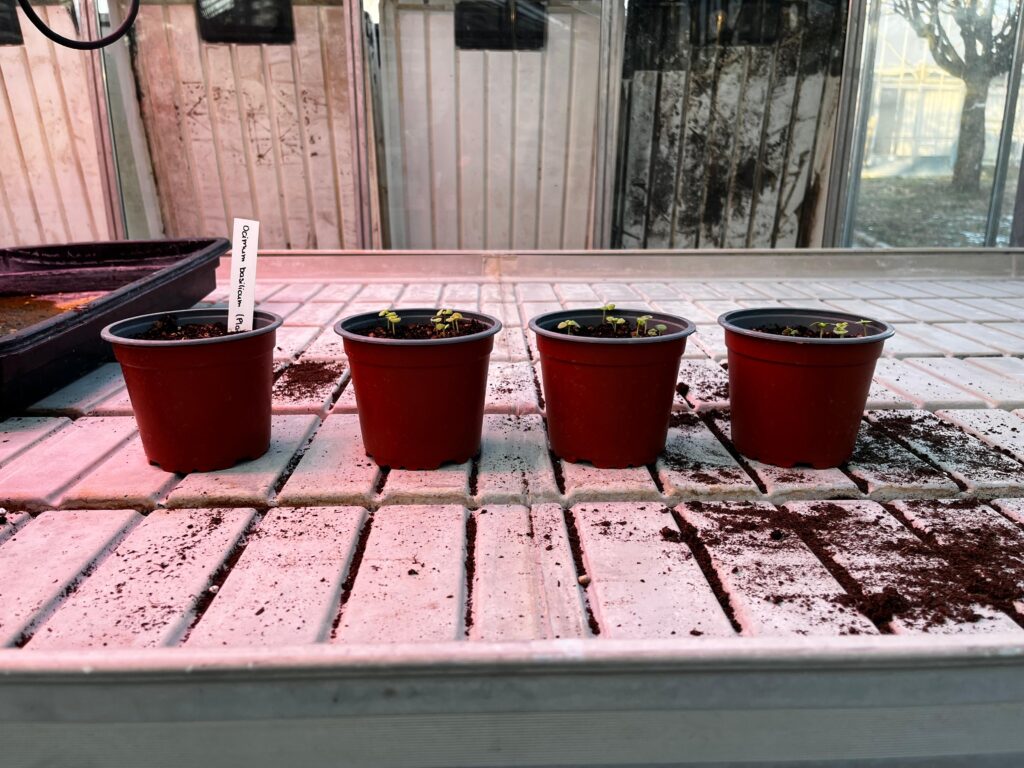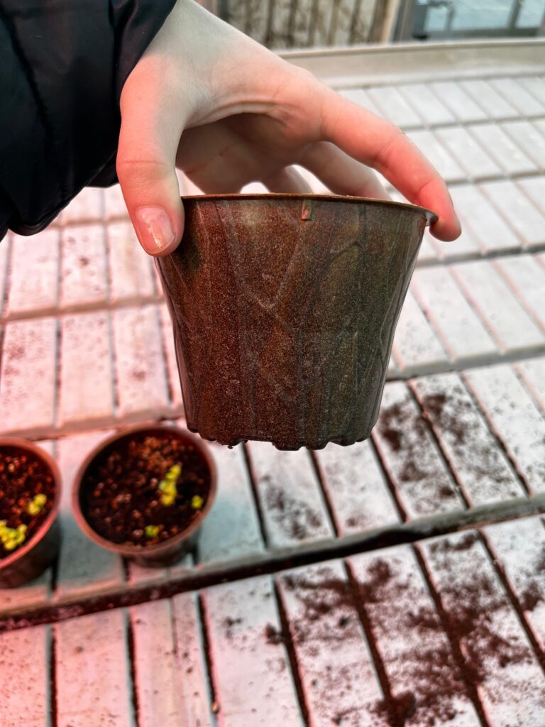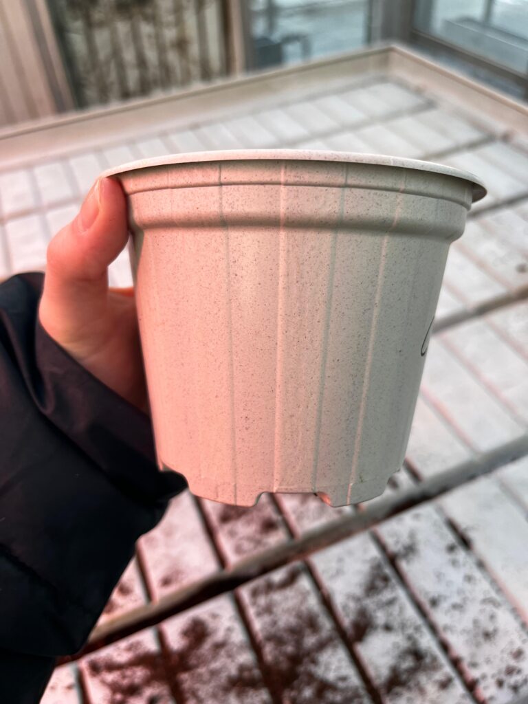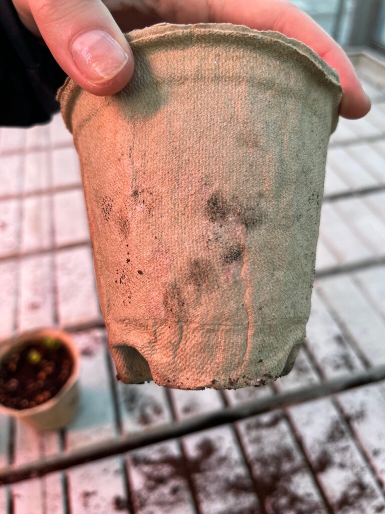 Der Papierpflanztopf wies erneut deutliche Schwarz‑/Lilaverfärbungen sowie eine stärkere Schimmelbildung am Boden auf. Die Pflanzen erreichten 3–4 Primärblätter, was das schwächste Ergebnis darstellte, und die ausgeprägte Feuchtigkeitsspeicherung scheint das Pflanzenwachstum hier stärker zu beeinträchtigen.