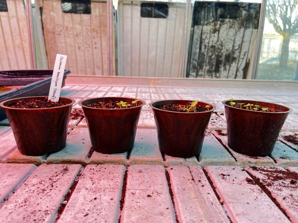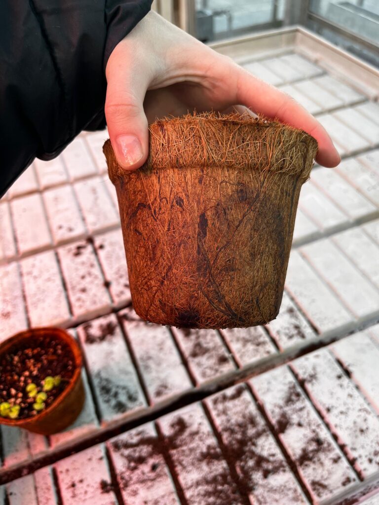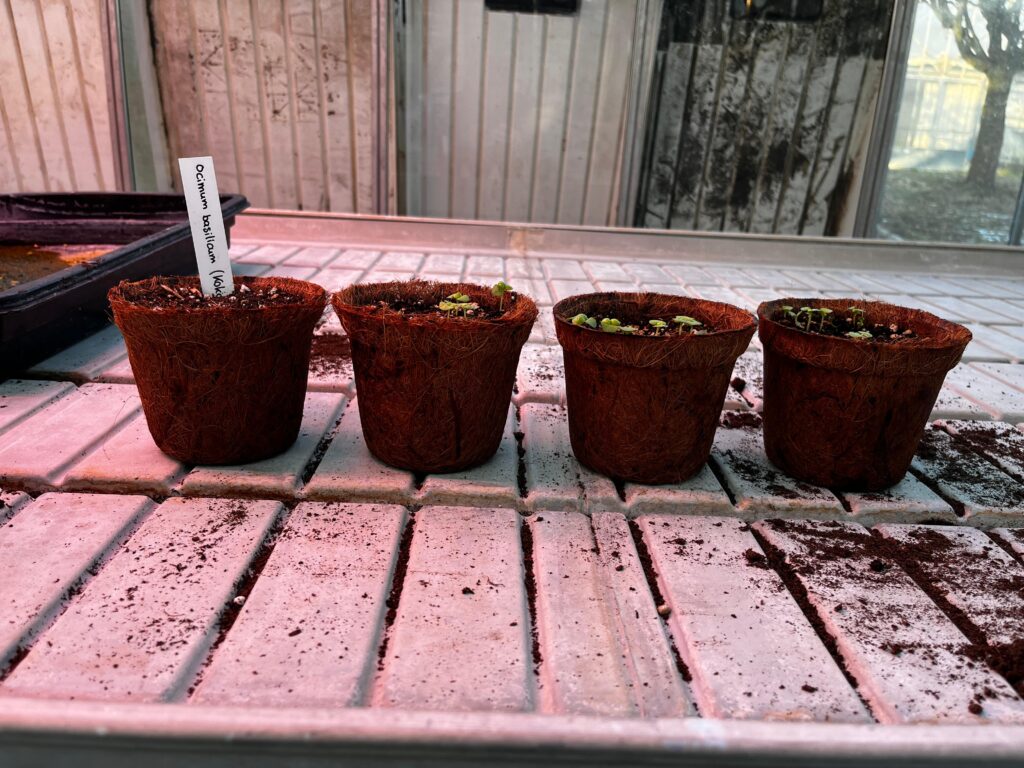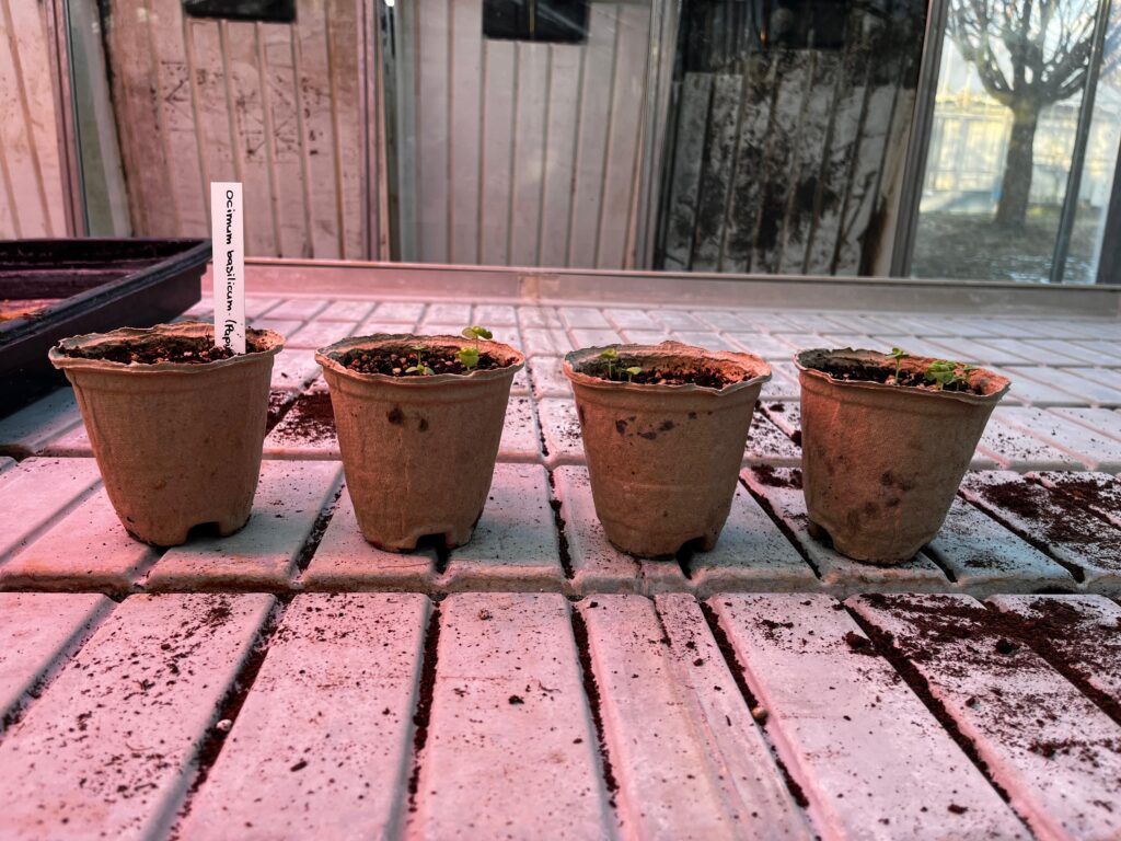 Der Kokostopf zeigte wieder leichte Schimmelbildung und eine Auftrennung am oberen Rand, blieb aber funktional stabil. Die Pflanzen entwickelten 6–8 Primärblätter, was das stärkste Wachstum aller biologisch abbaubaren Töpfe in diesem Versuch war, und zeigt, dass das feuchte Kokosmilieu für Basilikum besonders förderlich sein kann.